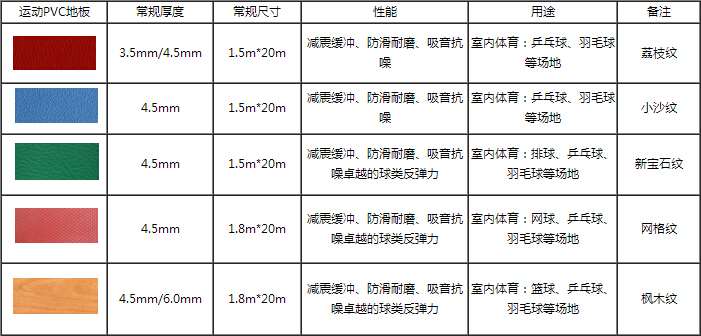 運(yùn)動(dòng)PVC地板 常規(guī)厚度 常規(guī)尺寸 性能 用途 備注